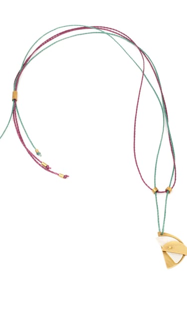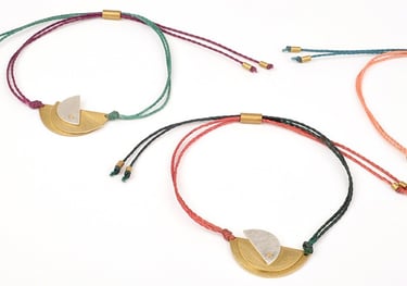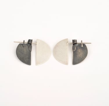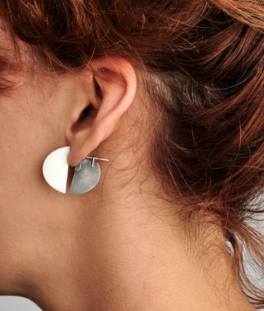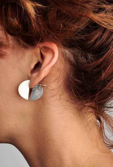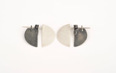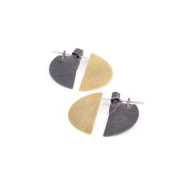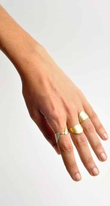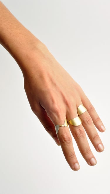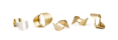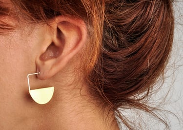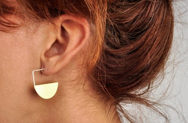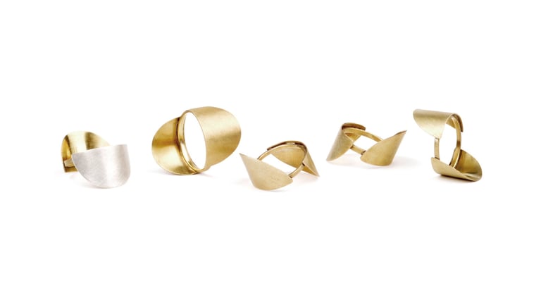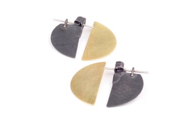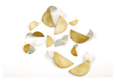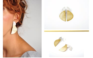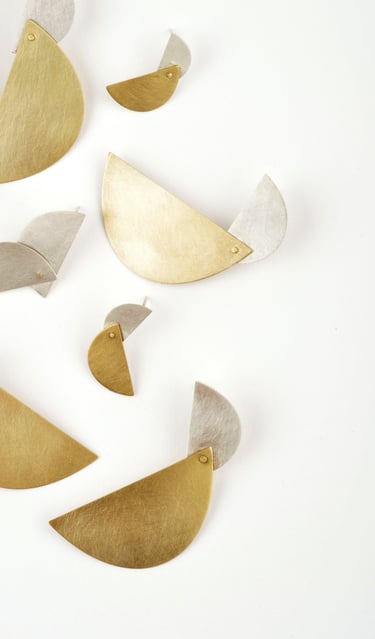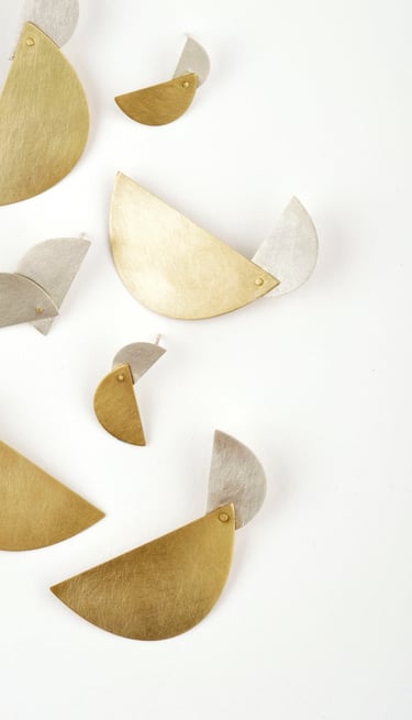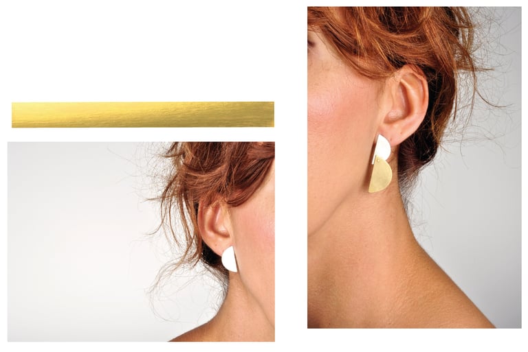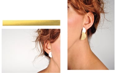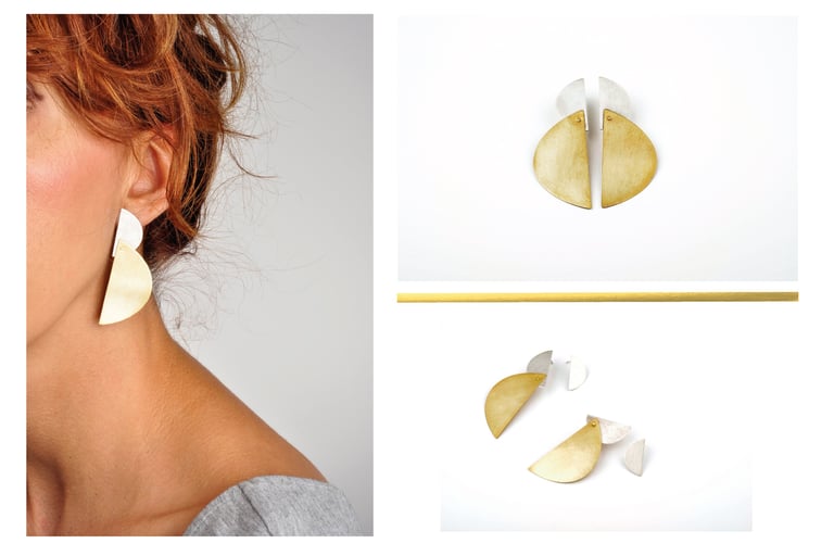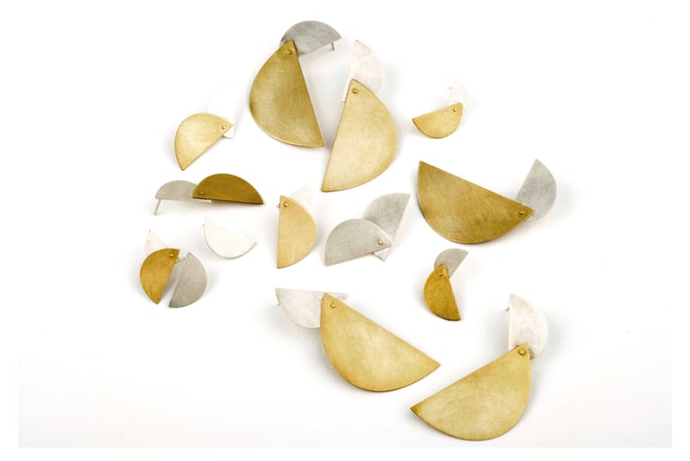 Semicírculos combinando dos metales como el latón y la plata con una textura rayada y mate, geometría y movimiento de las piezas