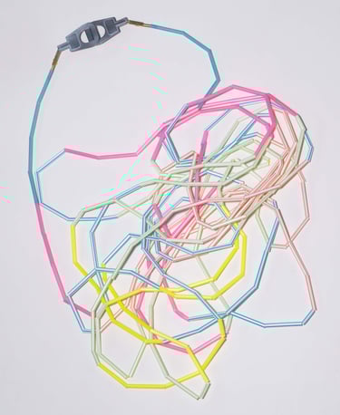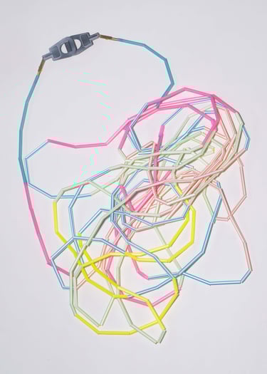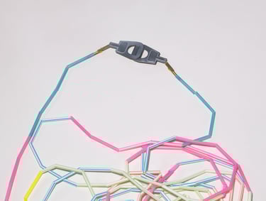 He utilizado elementos y tapones de botellas de agua como base de las piezas, cañitas de plástico con cierre metálico como el de las latas. Todos estos plásticos y residuos los encontramos en la arena de las playas y en el agua, siendo ingeridos por la fauna marina acumulándose en su interior.
