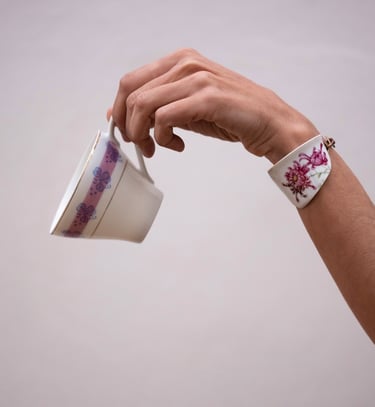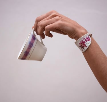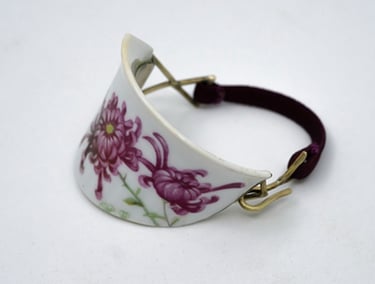 Esta taza rota me la encontré en el suelo en medio de un camino, me encantó el dibujo del crisantemo que tiene, y pensé darle una nueva vida convirtiéndola en una pulsera que encaja perfectamente en mi muñeca.