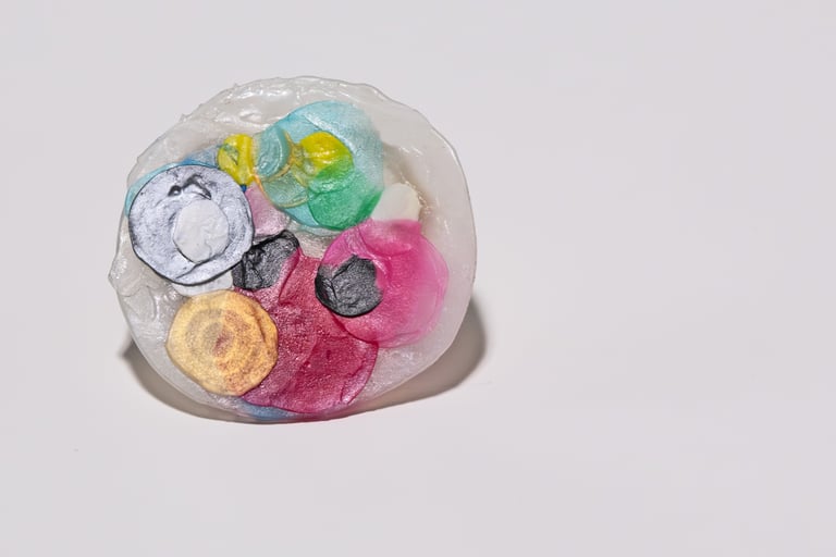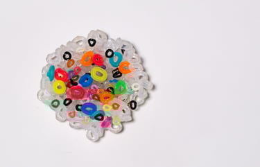 He utilizado elementos y tapones de botellas de agua como base de las piezas, cañitas de plástico con cierre metálico como el de las latas. Todos estos plásticos y residuos los encontramos en la arena de las playas y en el agua, siendo ingeridos por la fauna marina acumulándose en su interior.